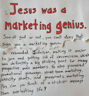 Jesus das Marketing-GenieLernen von unseren WurzelnKürzlich wurde ich auf ein Bild aufmerksam gemacht, das ein «Chuck» in den sozialen Medien auf Instagram gepostet hat. Der Inhalt hat es in sich (siehe oben): Ob er der Sohn Gottes war oder nicht – du kannst nicht verleugnen, dass Jesus ein Marketing-Genie war. Jesus verhalf dem Judentum zu einem neuen Auftritt: Er machte es leichter, beizutreten und die Beschneidung abzulegen, die für viele potenzielle männliche Mitglieder ein beklemmender Punkt war. Jesus wusste genau, wie man die Aufmerksamkeit der Menschen gewann. Sein Leben war voller Überraschungen. Es war nicht möglich, vorauszusagen, was er als nächstes sagte oder tat. Jede Aktion und jedes Wort war eine Neuigkeit.Die Parabeln von Jesus waren aus dem Alltagsleben gegriffen und hatten mit dem Interesse der Menschen zu tun. Jesus war auch ein Pionier von Werbegeschenken, mit einem Strassenteam-Marketing, öffentlichen Tricks und basisdemokratischem Marketing. Es gab so gute Tricks, dass diese niemand vergass: Er verwandelte Wasser in Wein, heilte die Blinden, fütterte 5000 Menschen mit zwei Broten und fünf Fischen, wanderte auf dem Wasser. Plus, kennst Du eine bessere Botschaft für ein Schild als ewiges Leben? Soweit die Übersetzung des geposteten Bildes. Obwohl es zurzeit von Jesus noch keine Zeitungen oder Bücher gab, weiss 2000 Jahre später die ganze Welt immer noch von ihm. In seinem Buch «The Man Nobody Knows» schrieb der US-Werbe-Guru Bruce Barton schon 1925, dass Jesus der Gründer der modernen Business-Prinzipien sei, der mit zwölf handverlesenen Personen eine Organisation gegründet hatte, welche die Welt erobert hat: «Keine Person der Geschichte in dieser Welt hat einen grösseren Einfluss auf die Herzen und Sinne der Menschen und Nationen als dieser Mann.» Die Bibel erzählt seine Geschichte und bleibt das am meisten verkaufte Buch Jahr für Jahr. Es wird geschätzt, dass bisher sechs Milliarden Bibeln gedruckt wurden. Sie wurde in mehr als 2000 Sprachen und Dialekte übersetzt. Laut dem Harvard-Professor Harvey Cox ist die Bergpredigt von Jesus der «am meisten strahlende, am meisten zitierte, am meisten analysierte und am meisten getestete Diskurs sowie der mit dem höchsten Einfluss auf Moral und Religion in der Geschichte der Menschheit». Marketing wird in einer globalisierten Welt mit einer Fülle von Information immer wichtiger. Unternehmen und ihre Produkte brauchen heute eine wiedererkennbare Marke und müssen für die Bedürfnisse der Kunden da sein. Diese Entwicklung macht auch vor Kirchen nicht halt. Die jüngste «Jesus ist…»-Kampagne zu Ostern des «Aktionskomitees Christen Schweiz» war ein gutes Beispiel dafür, in welche Richtung es gehen kann. Es wurde der direkte Dialog mit der Bevölkerung gesucht und auf Jesus aufmerksam gemacht. Viele Medien berichteten teilweise kreativ und witzig darüber, wie das Onlineportal Watson zeigt. Herzlich, Markus Baumgartner P.S. Den Award für Öffentlichkeitsarbeit gewann am Samstag Pfr. Daniel Simon (40,8% der Stimmen) vor Simone Maurer (36,6%) und Sr. Veronika Ebnöther (22,5%). Es wurden fast 800 Stimmen abgegeben. Bericht folgt nächste Woche.