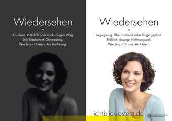 Eine ähnliche Aktion hatte die EKHN erstmals im Advent 2012 durchgeführt. Dabei hatte sie unter dem Motto «Weihnachten ist Geburtstag» auf Weihnachten als Fest der Geburt von Jesus hingewiesen. Die damals dem Brief beigelegte farbenfrohe Girlande hatte für Überraschung und Kritik gesorgt. Auch der Osterpost liegt eine Motivkarte bei: Zum Thema «Lichtblick Ostern» wurde der Balanceakt zwischen Karfreitags-Trauer und Oster-Hoffnung illustriert (siehe Bild). Schlüsselwort der Karte ist «Wiedersehen». Dieses Grusswort steht im Sprachgebrauch für Abschied, vom Wortsinn aber für die Zuversicht, dass das gemeinsame Leben weitergeht – wie der Tod und die Auferstehung von Jesus Christus.